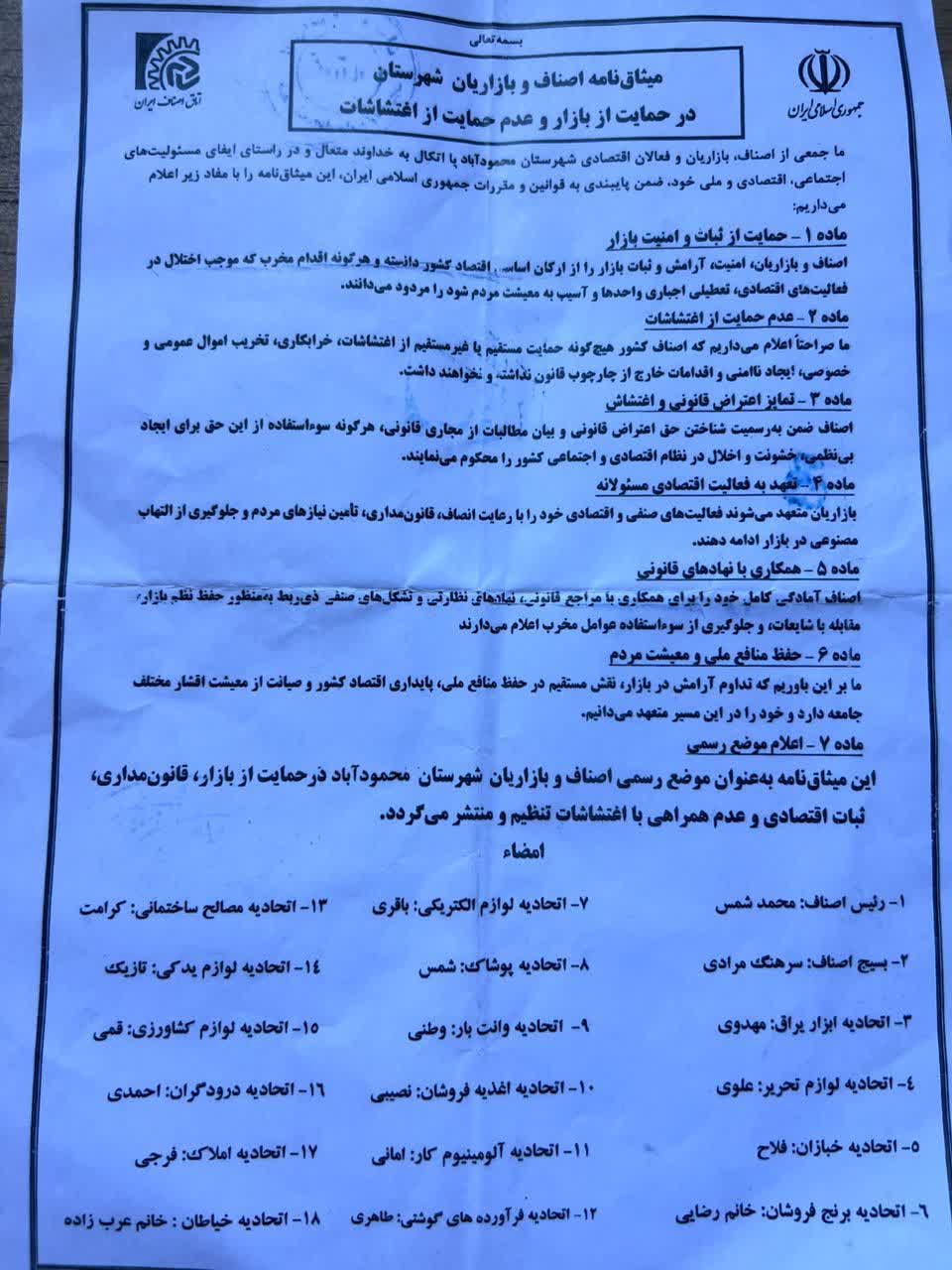 این میثاقنامه به عنوان موضع رسمی اصناف و بازاریان شهرستان محمودآباد در حمایت از ثبات اقتصادی، قانونمداری و امنیت بازار منتشر شده است.